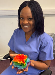 In preparation for this year’s event Jannet Perez-Gonzalez, Nurse Associate in the Mental Health RDT was joined by OH CRF colleagues to make flowers out of coloured paper to wear as hats and decorate the stand. The coloured paper used reflects the Pride rainbow logo.